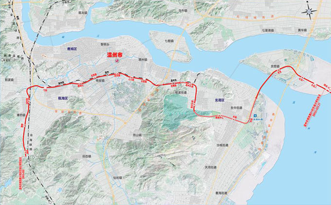 S1線一期工程:西起沿海鐵路溫州南站南端潘橋鎮(zhèn),向東北繞出至溫州西站,沿既有金溫鐵路通道至溫州東站,過(guò)溫州東站后線路折向西南沿龍灣區(qū)南洋大道、前房路至機(jī)場(chǎng),在機(jī)場(chǎng)航站樓西側(cè)設(shè)機(jī)場(chǎng)站,出站后向北跨甌江南口至靈昆島折向東至一期工程終點(diǎn)甌采站。